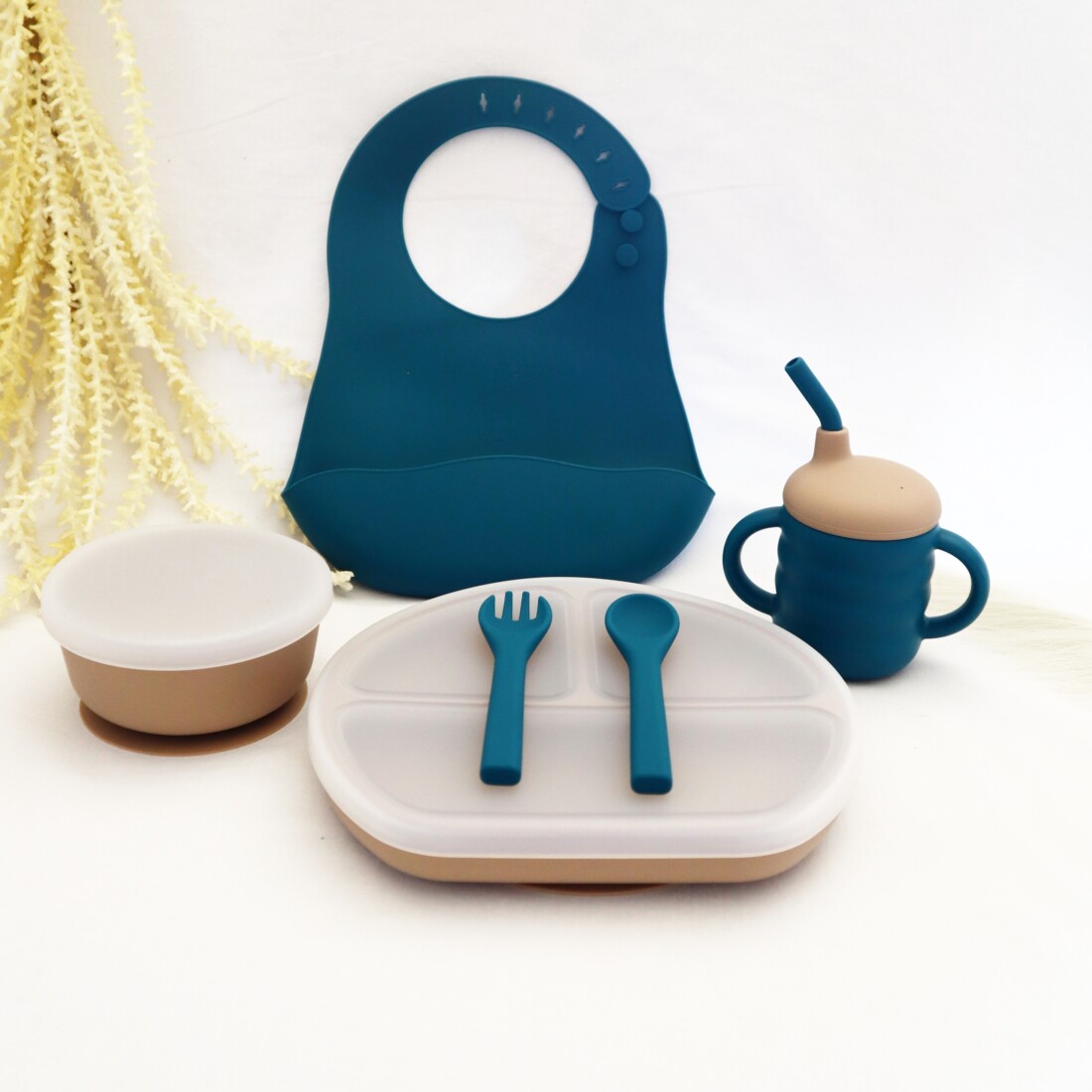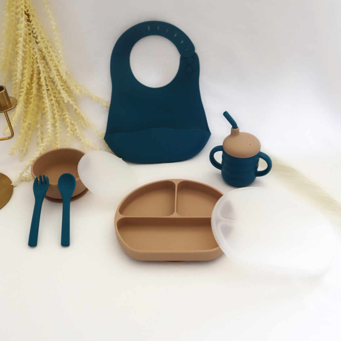 Περιεχόμενα Σετ: Πιάτο με καπάκι, Mπολ με καπάκι, Σαλιάρα, Ποτήρι με καλαμάκι, Κουτάλι και πιρούνι από σιλικόνη.