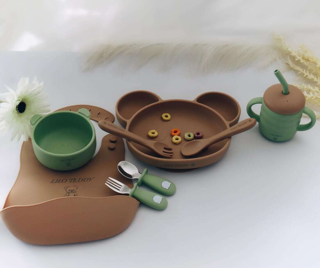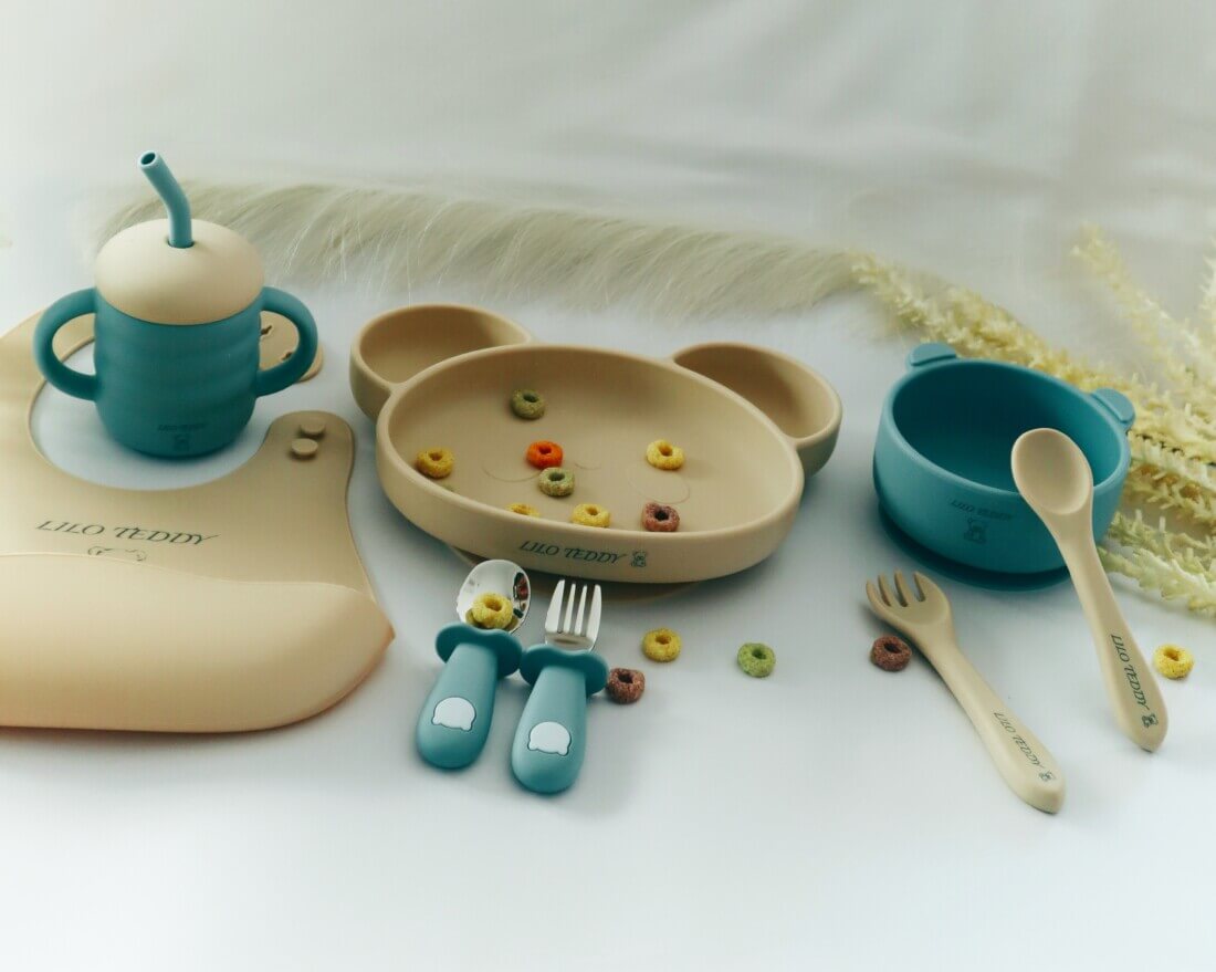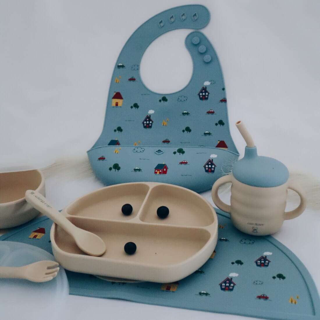 Περιεχόμενα Σετ: Πιάτο με καπάκι, Mπολ με καπάκι, Σαλιάρα, Ποτήρι με καλαμάκι, Κουτάλι και πιρούνι από σιλικόνη και Σουπλά.