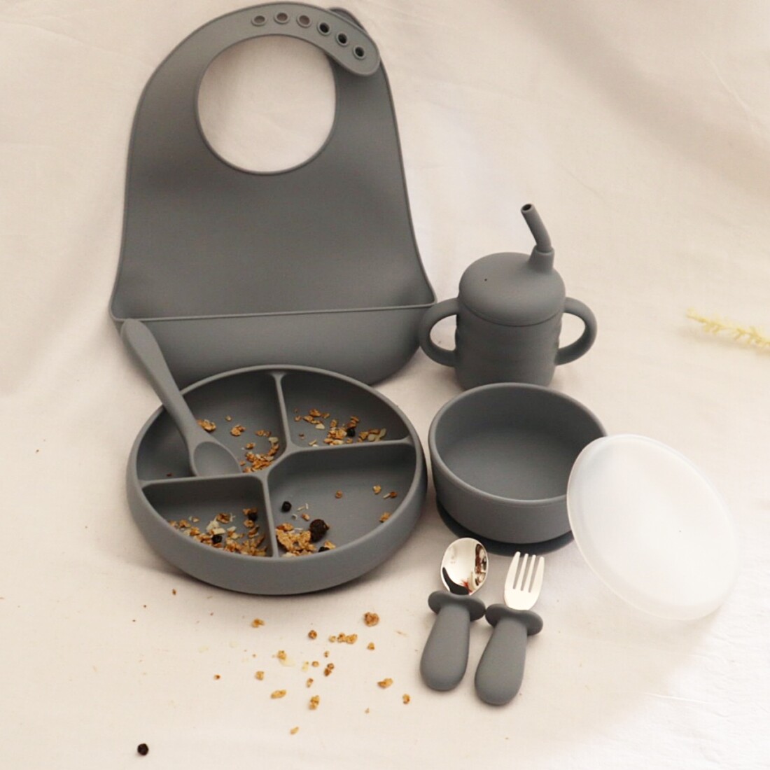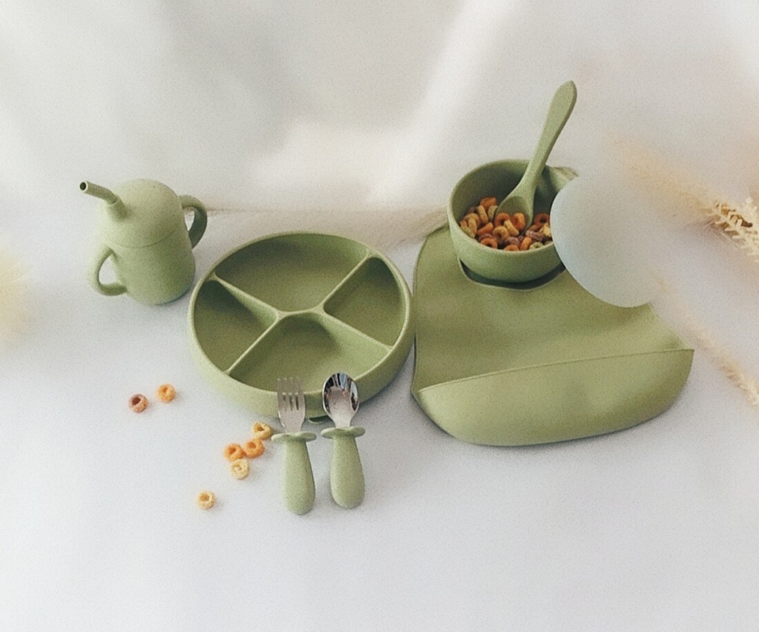 Περιεχόμενα Σετ: Πιάτο με 4 χωρίσματα, Μπολ με καπάκι, Σαλιάρα, Ποτήρι με καλαμάκι, Κουτάλι και πιρούνι από ανοξείδωτο ατσάλι με λαβή από σιλικόνη και Κουτάλι από σιλικόνη.